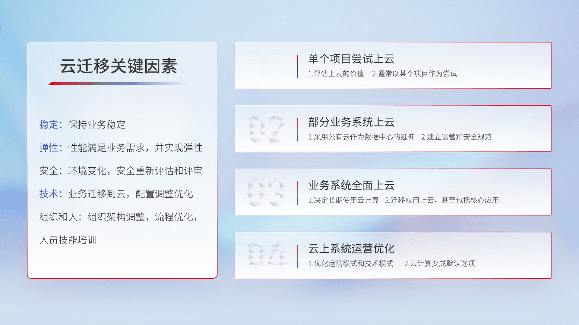 结合实际业务,,从规划设计、、云平台选型、、、、云原生改造、、、、数据迁移、、、、集成交付,,迁移全过程为客户识别最佳上云路径,,,,做好风险识别管理,,,设计网络架构、、、身份权限、、、安全审计合规、、操作审计、、、、日志审计、、、、监控告警策略、、多站点容灾设计等,,,,对云上基础设施进行整体规划,,,,提升IT治理水平,,,,以满足弹性、、高可用、、高性能的需求。。。