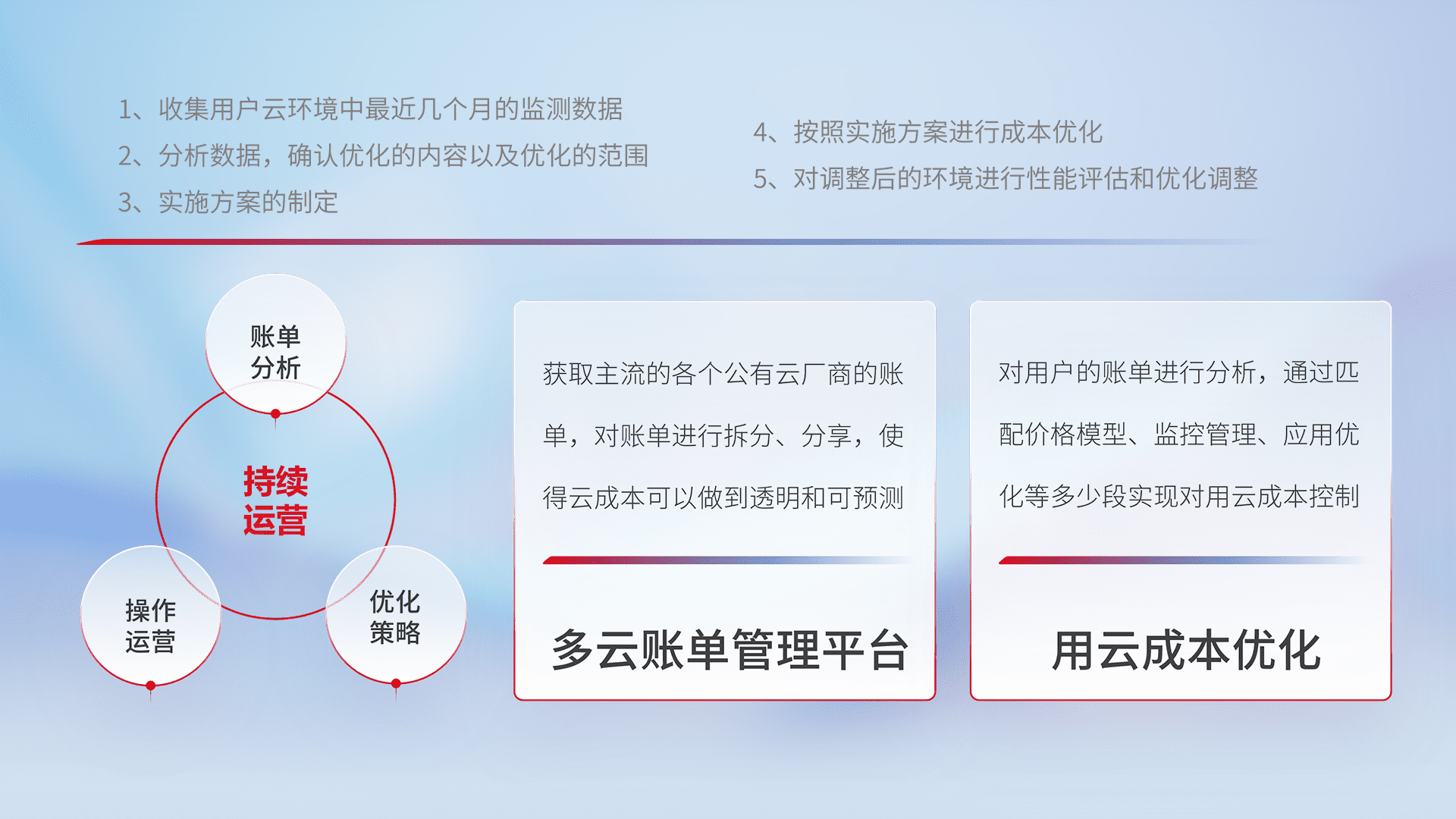 通过多云纳管,,,,以统一的资源数据模型把客户的云资源进行抽象和封装,,进而实现对多云资源的统一操作,,,,保障云资源管理的可靠性、、、、稳定性与可用性。。量身定制化运维内容,,配置、、开发运维、、、补丁管理、、备份、、、、监控、、、、认证和访问管理、、、、审计和日常巡检等,,,保障在用云过程中的可靠度,,稳定度以及高可用率。。